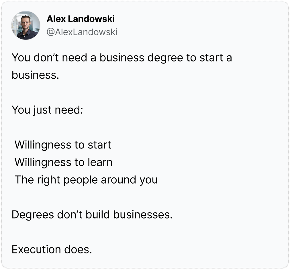 Starting a business isn’t about formal education—it’s about action. With the courage to begin, a mindset for learning, and the right support network, execution will always matter more than a degree.