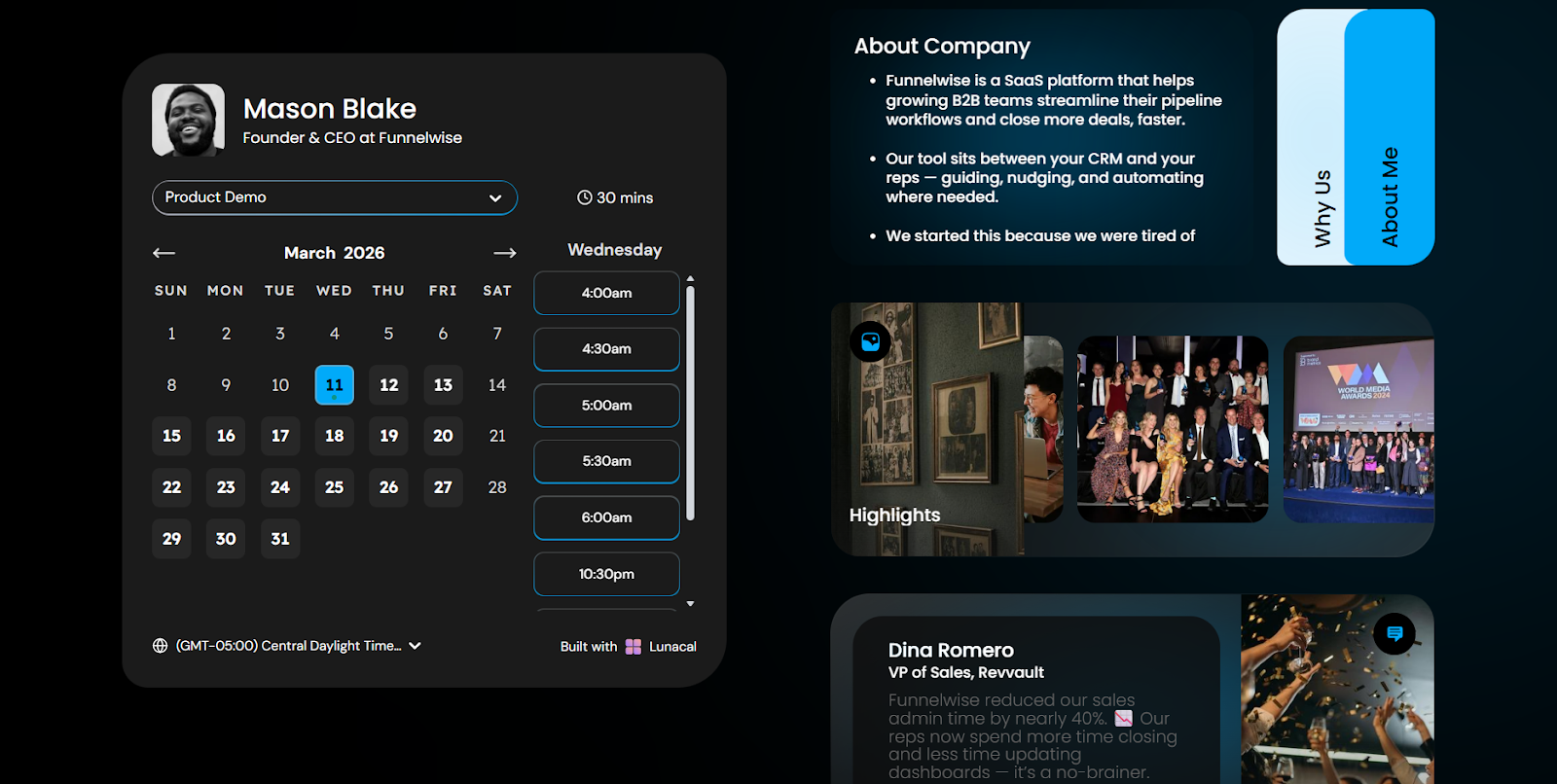 Lunacal is a strong option when your booking page needs to increase conversion rates, by answering doubts and building trust. If you want the scheduling experience to reinforce your brand, answer objections, and increase the likelihood of a visitor booking a call, Lunacal’s richer booking page layout can provide an advantage over simpler calendar tools. It’s also a good fit for teams who need advance features like round-robin scheduling, group bookings, packages, workflows, GDPR compliance, etc.